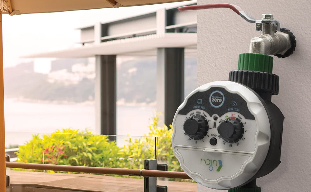 Kuglasti ventil unutar regulatora Zero Pressure montiranog na slavinu omogućuje protok vode bez pada tlaka. Regulator se može instalirati na sustave s kap po kap navodnjavanjem, što ga čini idealnim za kućne vrtove ili terase. Dva programirajuća kotačića omogućuju podešavanje učestalosti i trajanja zalijevanja, dok tipka za odgodu omogućuje odgodu prvog pokretanja do najviše dva sata. Prvo zalijevanje uvijek se odvija na kraju postavljenog intervala, na primjer: ako je postavljena učestalost od 12 sati, prvo zalijevanje započet će 12 sati nakon programiranja. Ako se tipka za odgodu pritisne jednom ili dvaput, zalijevanje će se umjesto toga odviti nakon 13 ili 14 sati.